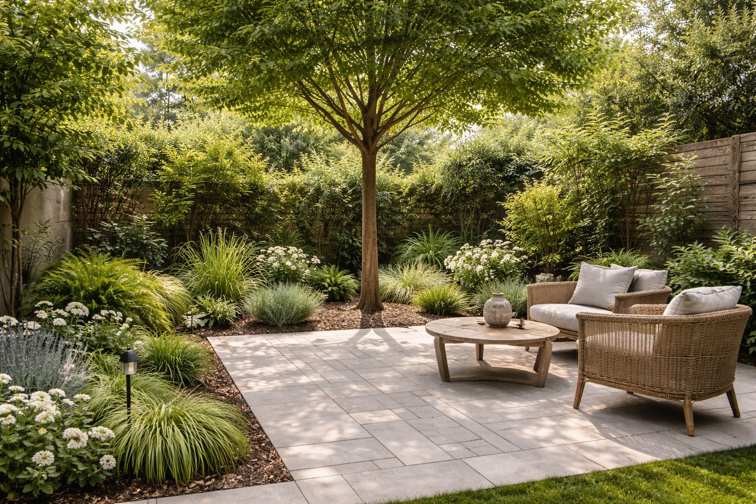Als je het ontwerp rustig houdt, voelt een kleine tuin met groenblijvende bomen voor kleine tuin juist groter: je hebt een stabiele achtergrond die de ruimte optisch ordent.
