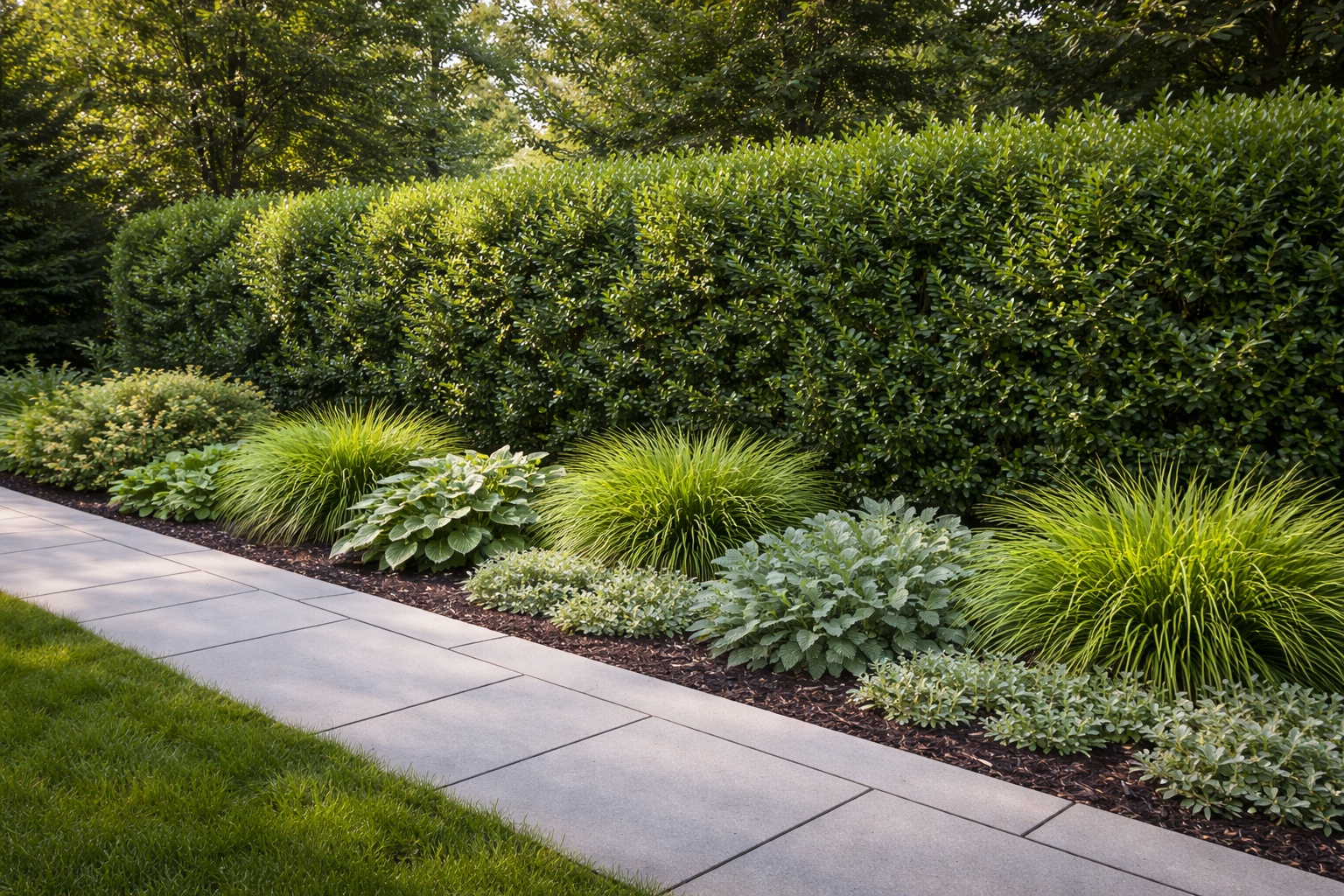 - Gebruik struiken als rustige basis langs de rand voor privacy.